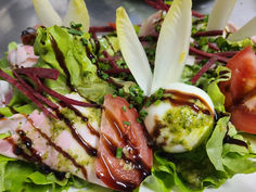 Salade aux gésiers, emmental, lardons, tomates confites et vinaigre de framboise 12€